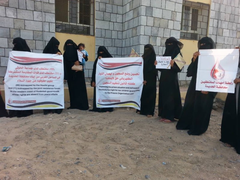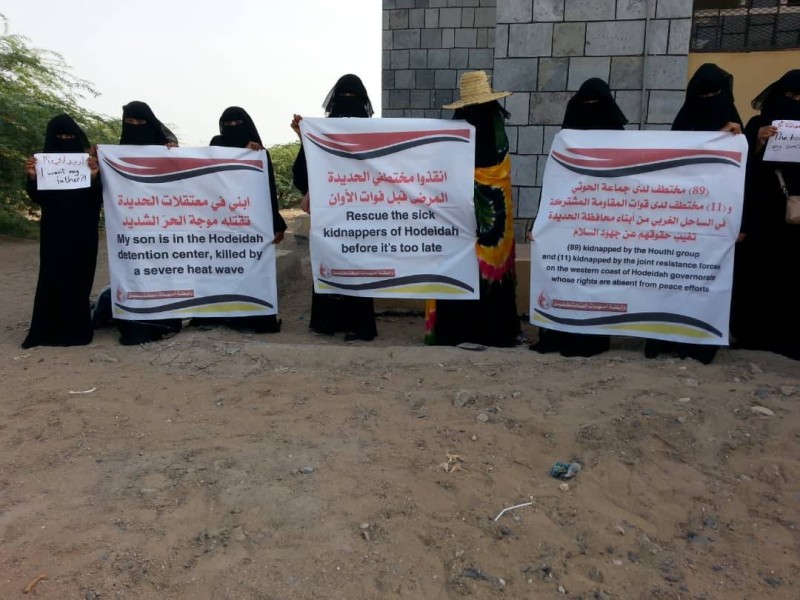 وقالت الأمهات في وقفة احتجاجية في محافظة الحديدة اليوم: أبناؤنا يعيشون في سجون ومعتقلات تفتقر لأبسط الاحتياجات من تهوية ومياه وتبريد، ويتفاقم وضعهم الصحي، خصوصاً مرضى الربو وضيق التنفس، وتنتشر بينهم الأمراض الجلدية المعدية. وأضافت: رصدنا 100 مختطف ومخفي قسراً في الحديدة، حيث يحتجزون في سجون بعضها معروفة وبعضها سرية منذ أعوام، والبعض تم احتجازهم في كونتيرات معدنية رغم الحر الشديد في الحديدة مع تغييب تام لحقوقهم وتجاهل لقضيتهم من قبل المنظمات الدولية.