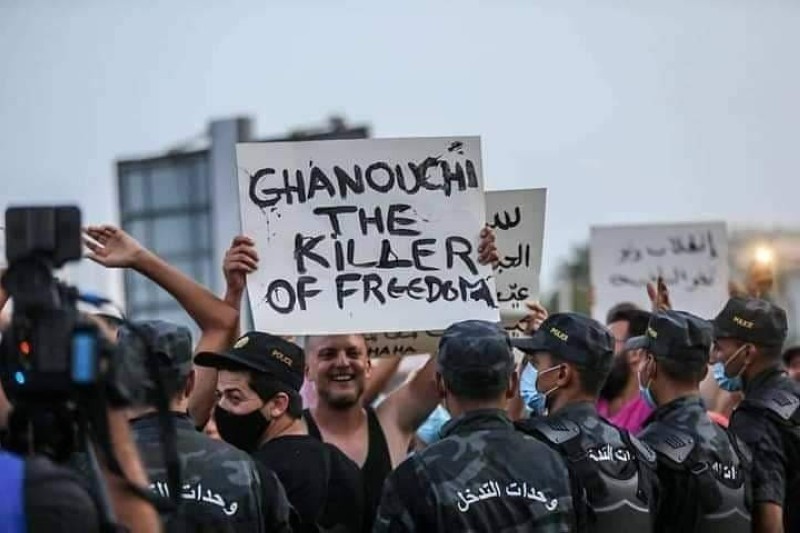 متظاهرون أمام البرلمان التونسي يحملون لافتة كتب عليها «الغنوشي قاتل الحرية».