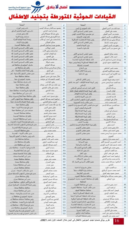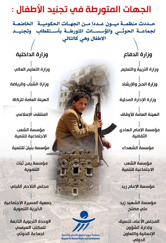 وأعلنت أن فريقها وثق تورط 125 قياديا في عمليات تجنيد الأطفال في مقدمتهم شقيق زعيم المليشيا يحيى بدر الدين الحوثي المعين وزيراً للتربية والتعليم في حكومة الانقلاب، وشقيقه محمد بدر الدين الحوثي، ومحمد علي الحوثي رئيس ما يسمى باللجنة الثورية العليا، والقيادات عبد الكريم أمير الدين الحوثي، عبد المجيد الحوثي، أحمد درهم المؤيدي، أحمد محمد حامد، عبده المحسن الطاووس، وضيف الله رسام.