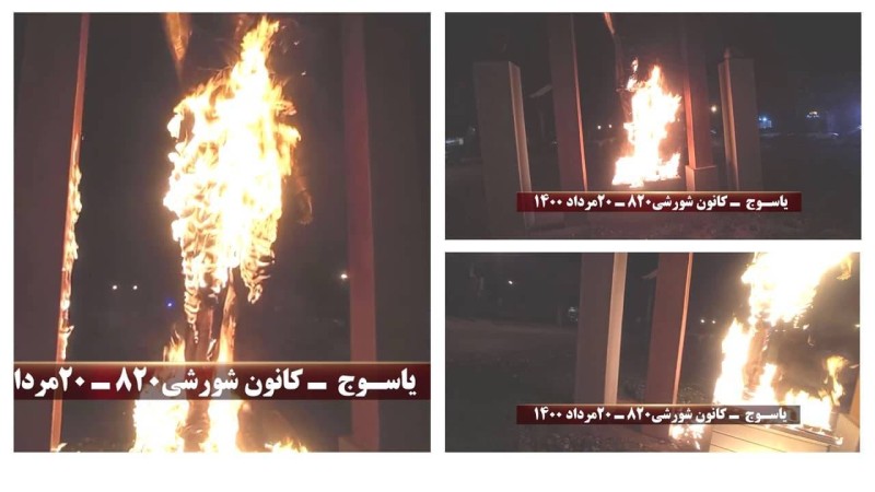 وجاء إشعال النار في التمثال الذي تم نصبه قبل أشهر قليلة، دعماً لانتفاضة الإيرانيين في جونقان التي كانت بشعار «الموت لخامنئي والموت لرئیسي والتحیة لرجوي» لاقى ترحيباً من المواطنين الإيرانيين.