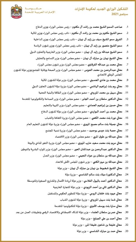 حكومة إماراتية جديدة.. 33 وزيرا بينهم 9 نساء