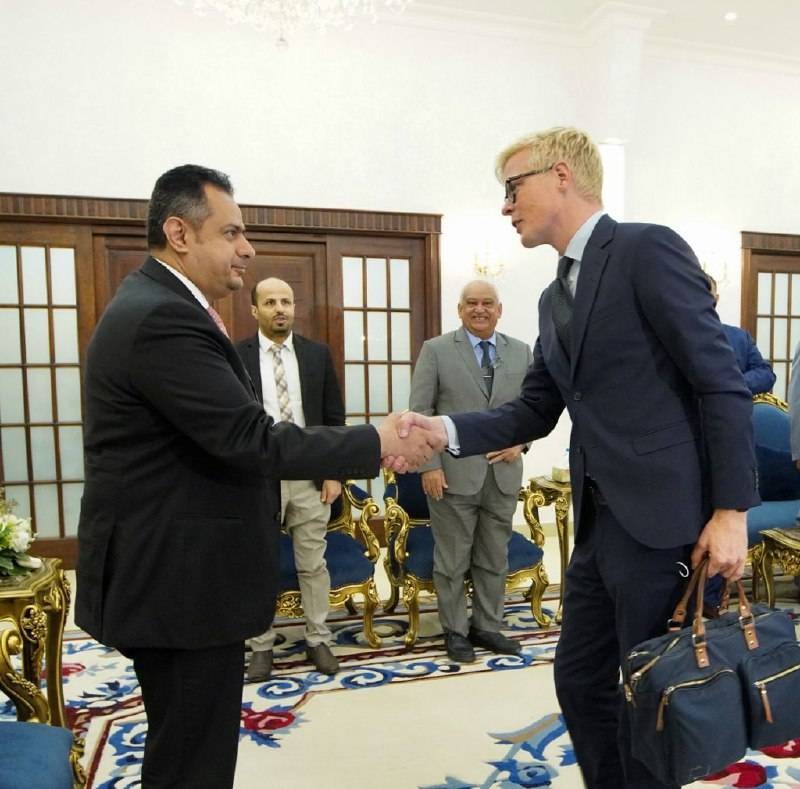 رئيس الوزاء اليمني أثناء استقبال المبعوث الأممي في عدن اليوم.