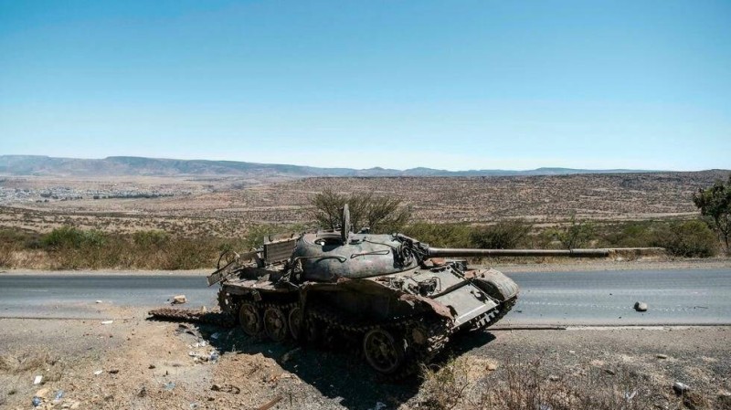 دبابة متضررة على طريق في شمال ميكيلي عاصمة إقليم تيغراي.