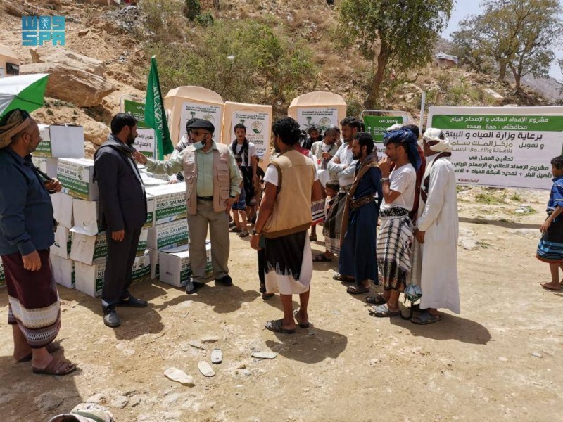 يمنيون في مديرية رازح بصعدة يتلقون معونات إغاثية مقدمة من مركز الملك سلمان.