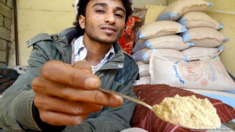 يمني يعرض شمة المخدر التي يروجها الحوثي.