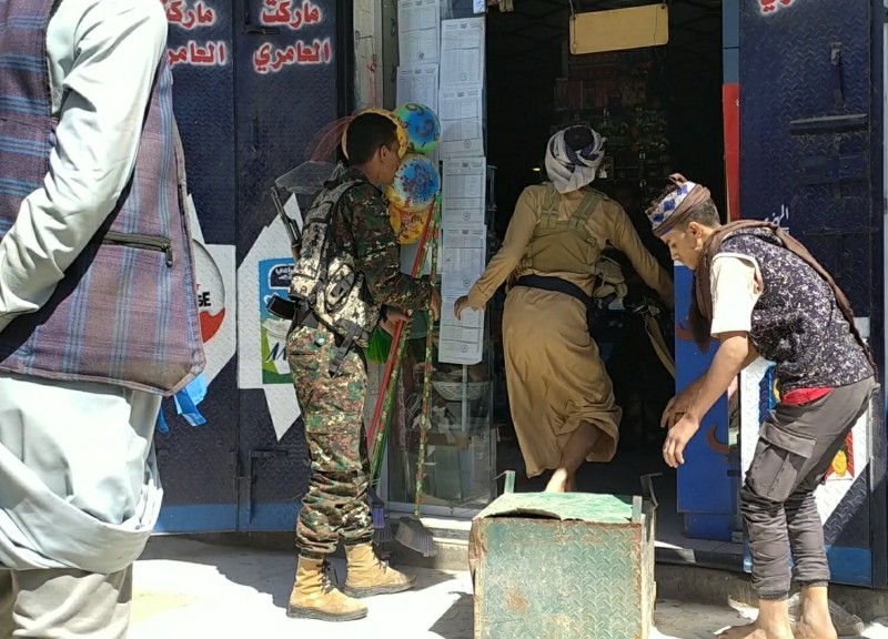 مسلحون حوثيون يعتدون على محلات تجارية في محافظة إب.