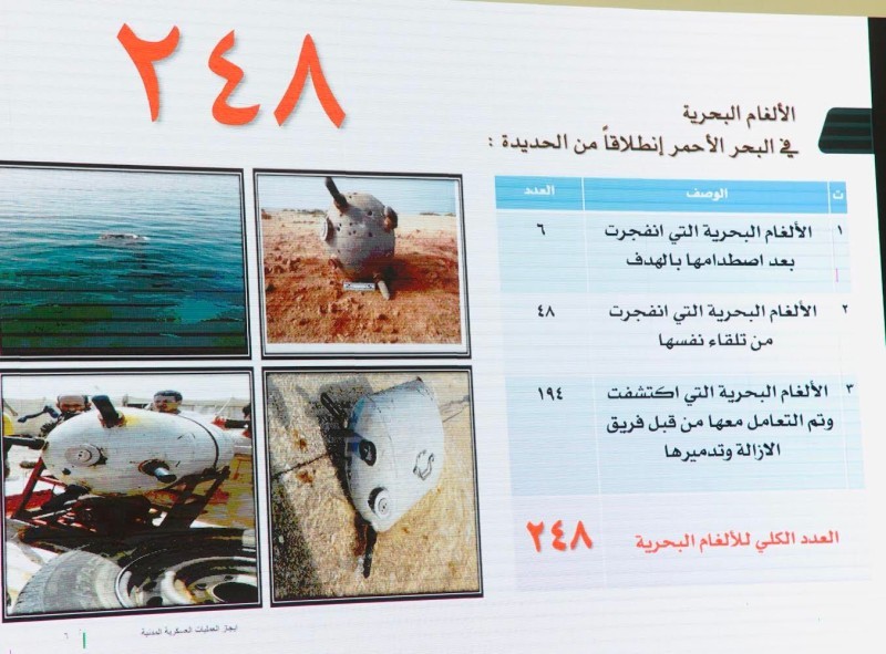 وذكر التحالف أن 248 لغماً بحرياً تم التعامل معها لتأمين الملاحة جنوب البحر الأحمر وأن مليشيا الحوثي هاجمت القاطرة «رابغ 3» جنوب البحر الأحمر.