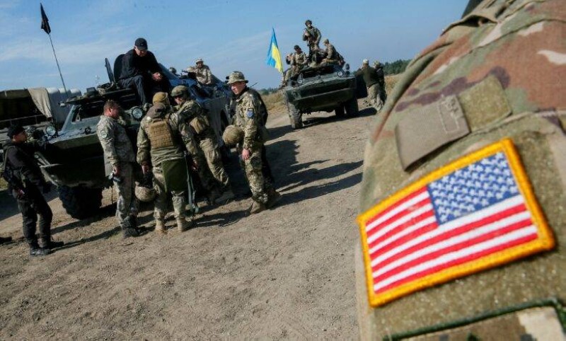 A military instructor of the U.S. Army is seen near Ukrainian servicemen during multinational drills "Rapid Trident 2019" at the International Peacekeeping and Security Center near Lviv, Ukraine September 24, 2019. REUTERS/Gleb Garanich