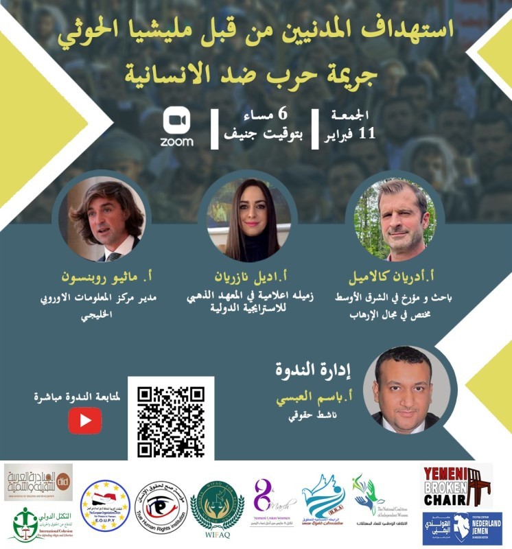 اتهم الباحث في مجال الإرهاب أدريان كالاميل مليشيا الحوثي بارتكاب جرائم حرب متعددة من خلال قصف المدن والمدنيين بالصواريخ، واصفا ذلك بأنه عمل إرهابي يضاف إلى تجنيد الأطفال واعتقال النساء واستخدام السكان دروعا بشرية.