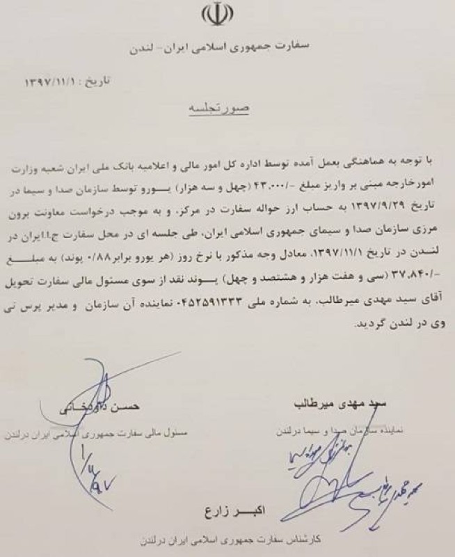وفي وثيقة أخرى، يقدم سيد مهدي ميرطالب (مدير فرع «برس تي في» في لندن) في رسالة مطبوعة إلى بيمان جبلي، تم إرسال نسخة منها أيضًا إلى نوروزي «المدير الإداري والمالي لمجمع سعادت آباد» (مركز معاونية الإعلام الخارجي لمؤسسة الإذاعة والتلفزيون للنظام) وسيطا غير إيراني للالتفاف على العقوبات بإيداع النقود في حسابات مأجوري النظام ومرتزقته مقابل رسوم قدرها 5٪. وجاء محتوى هذه الوثيقة: «بكل احترام وكما تعلمون، فإن إرسال الحوالات إلى مكتب لندن يواجه العديد من المشكلات بسبب تصعيد العقوبات الجائرة للدول الغربية، حيث تم غلق 8 حسابات مصرفية من مجموعة لندن حتى الآن. ونظرا إلى الظروف غير المواتية والعقوبات المتزايدة، فإن أي تحويلات من دول أخرى ستؤدي إلى تعطيل حسابات هذه المجموعة، لذلك تبقى الطريقة الآمنة الوحيدة لإرسال الأموال عبر البنوك داخل لندن».
