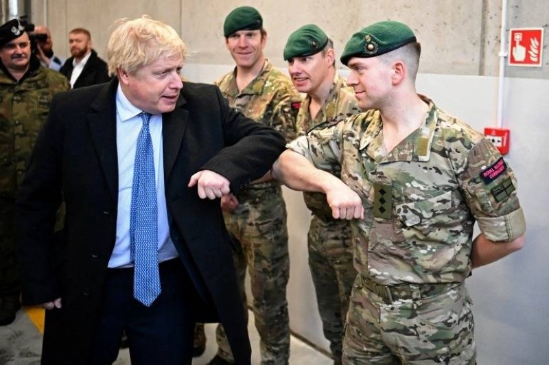 بوريس جونسون أثناء زيارته القوات البريطانية التي نُشرت في بولندا على حدود بيلاروسيا لتعزيز الوجود المتقدّم لحلف الناتو.
