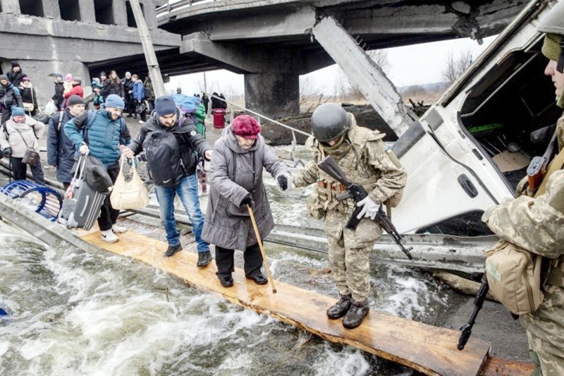 أوكرانيون يفرون من إربين قرب كييف عبر جسر مدمر هرباً من القصف الروسي.