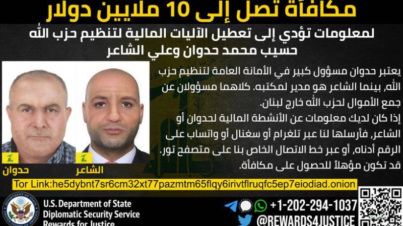 رصدت وزارة الخارجية الأمريكية مكافأة تصل إلى 10 ملايين دولار لمن يدلي بمعلومات تؤدي إلى اعتقال اثنين من ممولي مليشيا «حزب الله» اللبنانية. وأعلن برنامج المكافآت من أجل العدالة التابع للوزارة في تغريدة على تويتر اليوم (الأربعاء)، أن المكافأة ستعطى لمن يبلغ عن عمليات حسيب حدوان وعلي الشاعر المالية، محذرا من أن أعمال هذين الرجلين تضر اللبنانيين في الداخل والخارج.
