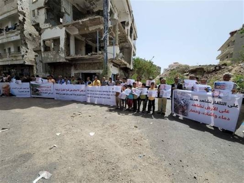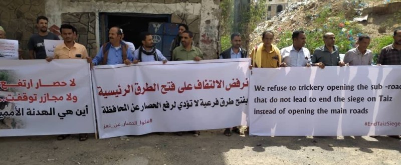 وأضاف المحتجون أن ما نشاهده اليوم من تحول هذا المطلب الإنساني إلى مجال للتفاوض والمقايضات السياسية يكشف حجم الإجرام الحوثي، والخلل القيمي الكبير في أداء الأمم المتحدة ومبعوثها إلى اليمن، مؤكدين أنه رغم المعاناة وتآكل ثقتنا بالأمم المتحدة والمجتمع الدولي فقد جاهدنا إحباطنا واستبشرنا خيرا بإعلان الهدنة التي تضمنت فتح الطرق في مدينة تعز، وها هو زمن هذه الهدنة يتلاشى الآن وسط صمت غريب، وتجاهل أممي لجريمة الحصار التي كان يفترض أن تكون في صدارة أولويات المبعوث الأممي، وصدارة عناصر الهدنة.