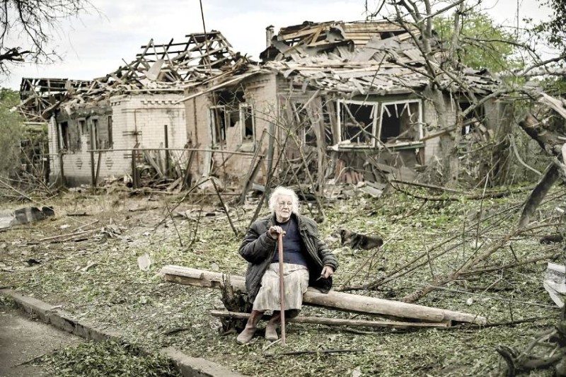 أوكرانية تجلس أمام منزلها الذي طاله القصف الروسي.