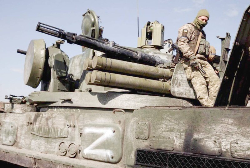جندي أوكراني فوق مدرعة روسية خارج خاركييف.