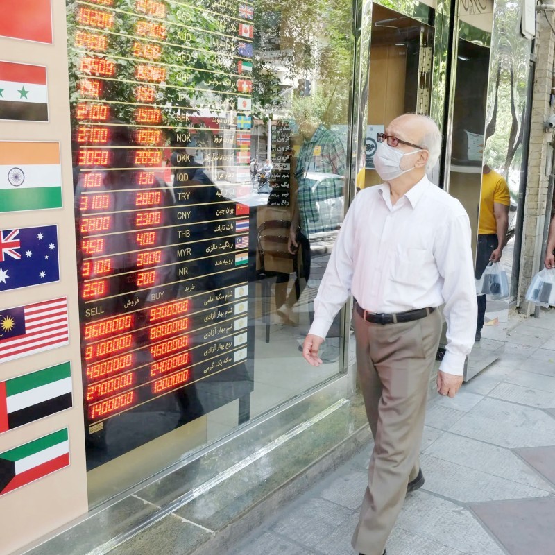 إيراني يتابع انهيار عملة بلاده في محلات الصرافة.
