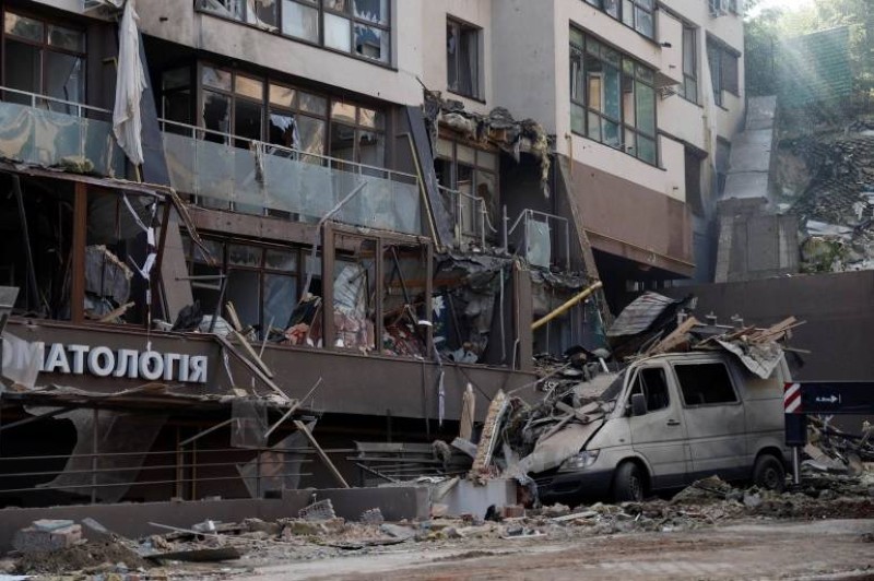 جانب من الدمار الذي أحدثه القصف الروسي للعاصمة كييف اليوم.