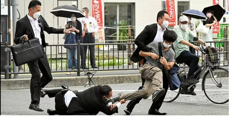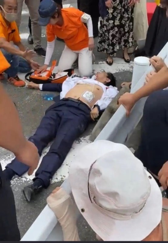 وأظهرت صورة لوكالة كيودو آبي راقدا على الأرض في الشارع ووجهه للأعلى والدماء تغرق قميصه الأبيض. وكان الناس متجمعين حوله وقام أحدهم بتدليك للقلب.