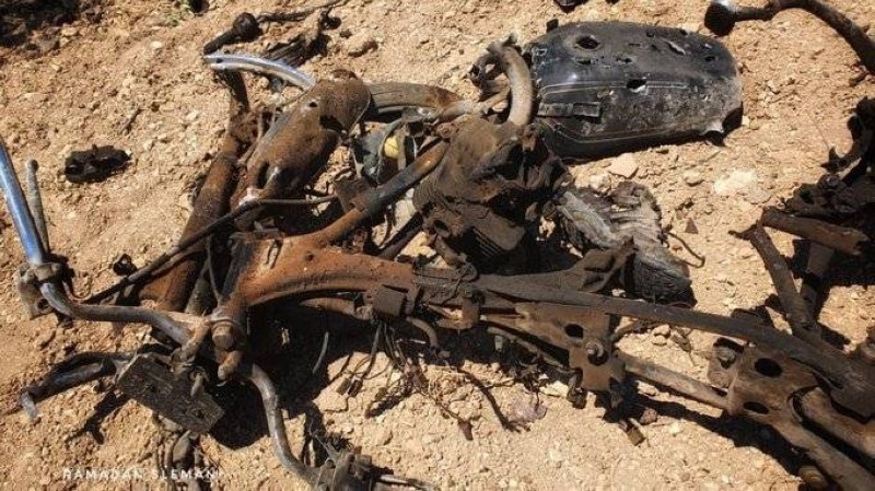 وأظهرت أولى الصور للضربة الجوية بقايا دراجة نارية محطمة ومتفحمة بالكامل تعود للقيادي الداعشي.