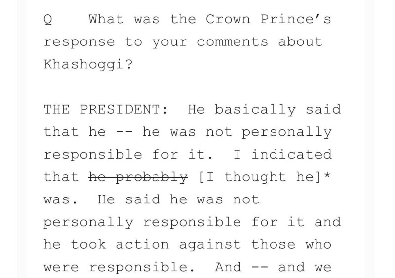 تراجع «البيت الأبيض» عن نص التصريح الذي جاء على لسان الرئيس الأمريكي جو بايدن للصحفيين، حول ما قاله لولي العهد الأمير محمد بن سلمان بن عبدالعزيز بشأن قضية خاشقجي، خلال حضوره قمة جدة للأمن والتنمية، وقام بتصحيحه رسمياً.