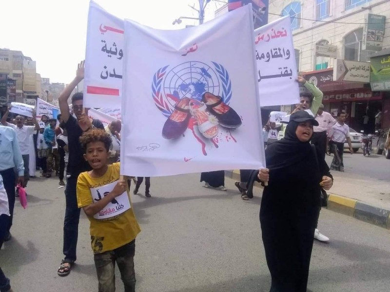 على واقع القصف الليلي الحوثي للأحياء السكنية والمواقع العسكرية في محافظة تعز، خرج المئات من المحتجين، اليوم (الثلاثاء)؛ للتنديد بتواطؤ وصمت الأمم المتحدة عن جرائم الحوثي خصوصاً بعد مقتل طفل وإصابة 11 آخرين السبت.