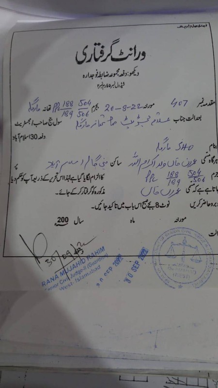 وحسب وسائل إعلام باكستانية فإن مذكرة الاعتقال التي صدرت بتاريخ 30 سبتمبر كانت بسبب تصريحات مثيرة للجدل ضد القاضية رنا مجاهد رحيم.