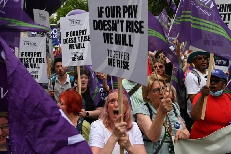 بريطانيون يحتجون على الأوضاع المعيشية وارتفاع التضخم ويطالبون برفع الرواتب.