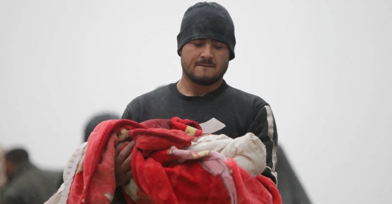 وفي محافظة إدلب، راج مقطع فيديو، لم يتسنّ التحقق من صحة توقيته، وهو يظهر طفلة معلقة، تدلى جسمها من بين الأنقاض، وهي على وشك السقوط من طابق علوي نحو الأسفل.