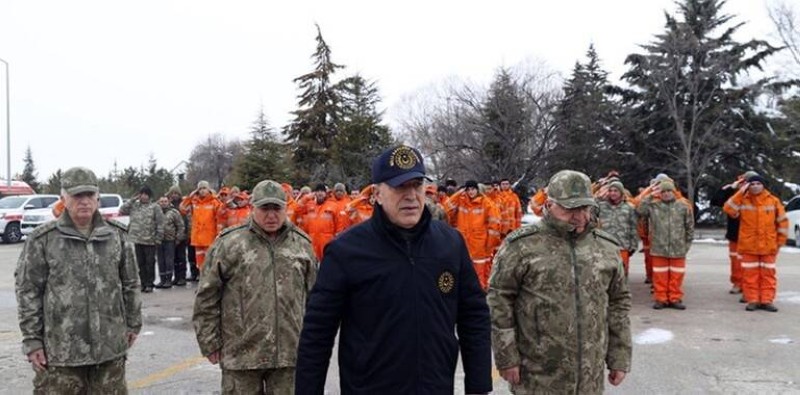 وتفقد وزير الدفاع التركي خلوصي أكار، برفقة رئيس الأركان يشار غولر وقائد القوات البرية موسى آفسافار، سير العمل في قاعدة عسكرية للنقل الجوي في أنقرة، ونقلت الوكالة عن أكار قوله إنه تم تشكيل خلية أزمة في وزارة الدفاع إثر الزلزال لتقديم المساعدات اللازمة.