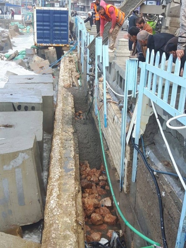 أعمال خرسانية في كورنيش الإسكندرية بسبب تشققات أرضية.