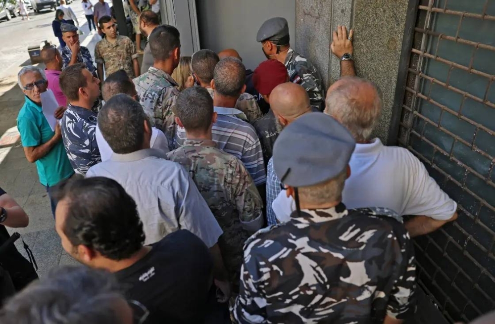 مواطنون ورجال أمن أمام أحد المصارف في لبنان.