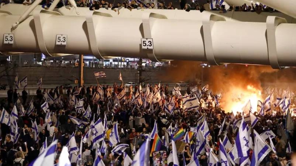 ونزل آلاف الإسرائيليين إلى الشوارع، مساء (الأحد/ الإثنين)، احتجاجاً على إقالة رئيس الوزراء بنيامين نتنياهو، لوزير الدفاع يوآف جالانت، الذي كان قد حث الحكومة على وقف خطة مثيرة للجدل لتعديل النظام القضائي. وظهرت حشود ضخمة تغلق الطريق السريع الرئيسي في تل أبيب، وكذلك مجموعة من المتظاهرين يشعلون النار في وسطه، فيما توجه متظاهرون لمنزل نتنياهو للاحتجاج ضد قرار الإقالة، ما دفع الشرطة الإسرائيلية للتدخل بمنعهم والاشتباك معهم.
