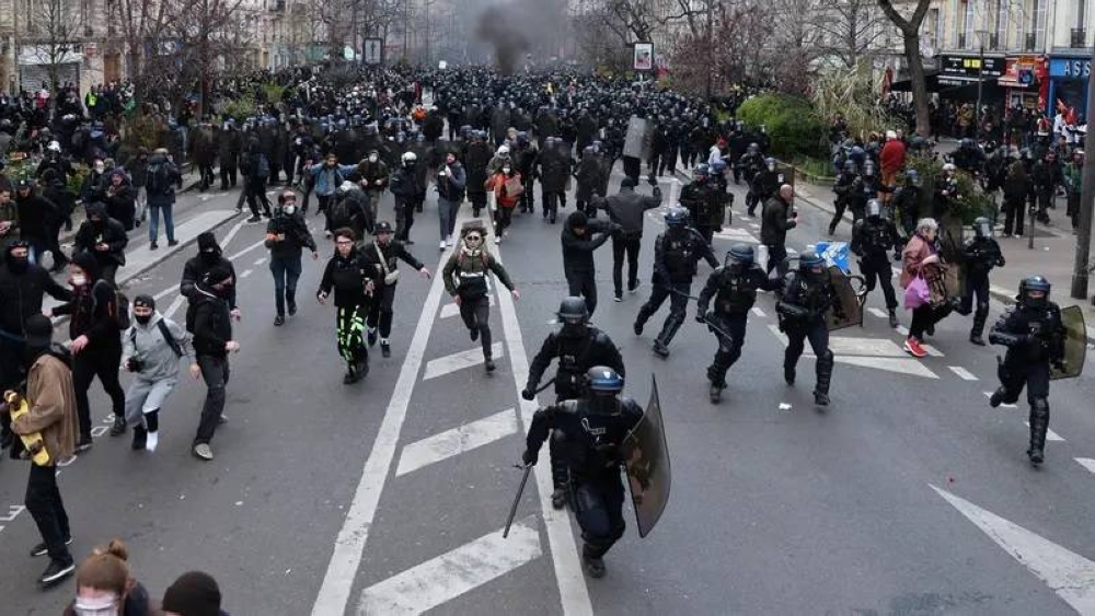 فيما استخدمت الشرطة قنابل الغاز المسيل للدموع، اندلعت، أمس (الثلاثاء)، صدامات في باريس بين الشرطة ومجموعة تضمّ مئات المتظاهرين كانت تتقدّم مسيرة يشارك فيها عشرات آلاف المحتجّين على تعديل نظام التقاعد وتأخير سن التقاعد عامين ليصبح 64 عاماً.