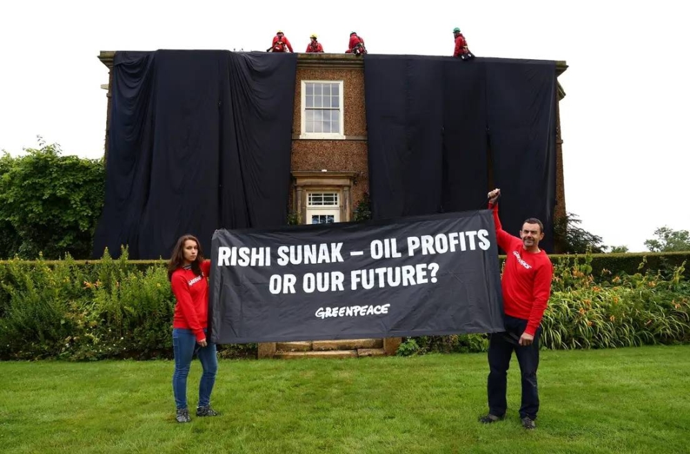 احتجاجاً على خطة الحكومة لتوسيع التنقيب عن النفط والغاز في بحر الشمال، غطى ناشطون من منظمة «غرينبيس» البيئية منزلاً يملكه رئيس الوزراء البريطاني ريشي سوناك في شمال إنجلترا اليوم (الخميس) بأغطية سوداء.