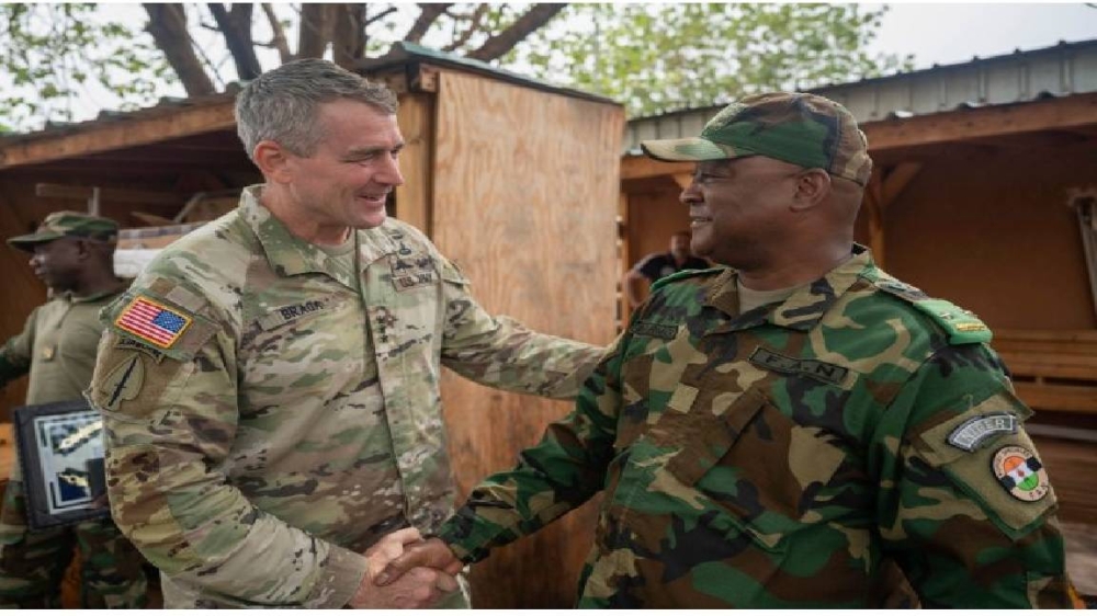 قائد العمليات الخاصة بالجيش الأمريكي جوناثان بارغا يلتقي العميد موسى سالاو بارمو أحد قادة الانقلاب في نيامي خلال يونيو الماضي.