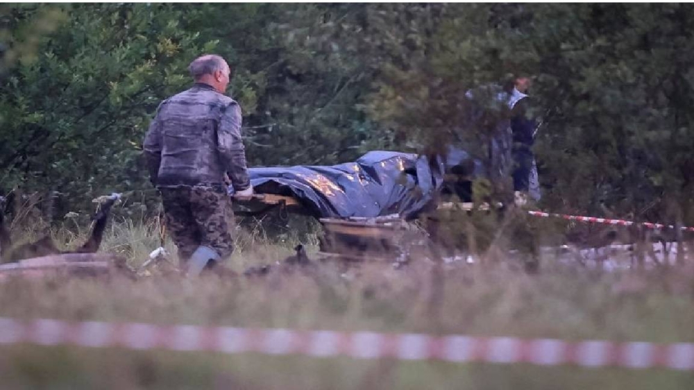 فرق الطوارئ الروسية تنقل جثثاً من موقع تحطم طائرة قائد «فاغنر». (وكالات)