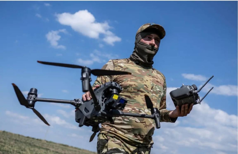 جندي أوكراني يستعد لإطلاق طائرة مسيرة.