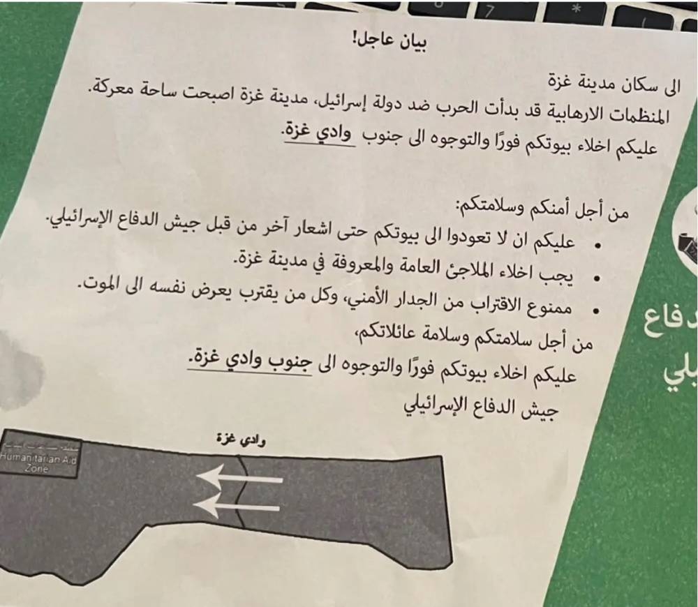 في تطور لافت، يشي باقتراب الاجتياح البري لغزة، دعت إسرائيل، اليوم (الجمعة)، عبر منشورات ألقاها طيران الاحتلال سكان شمال غزة إلى ترك منازلهم والتوجه جنوباً.