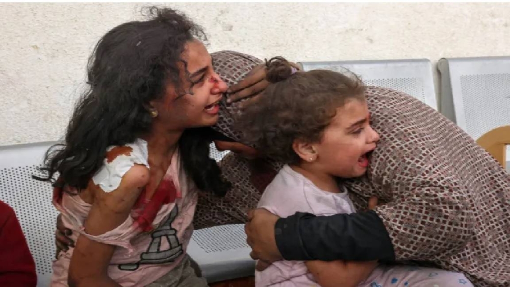 فلسطينية تحتضن طفلتيها المصابتين في القصف الإسرائيلي.