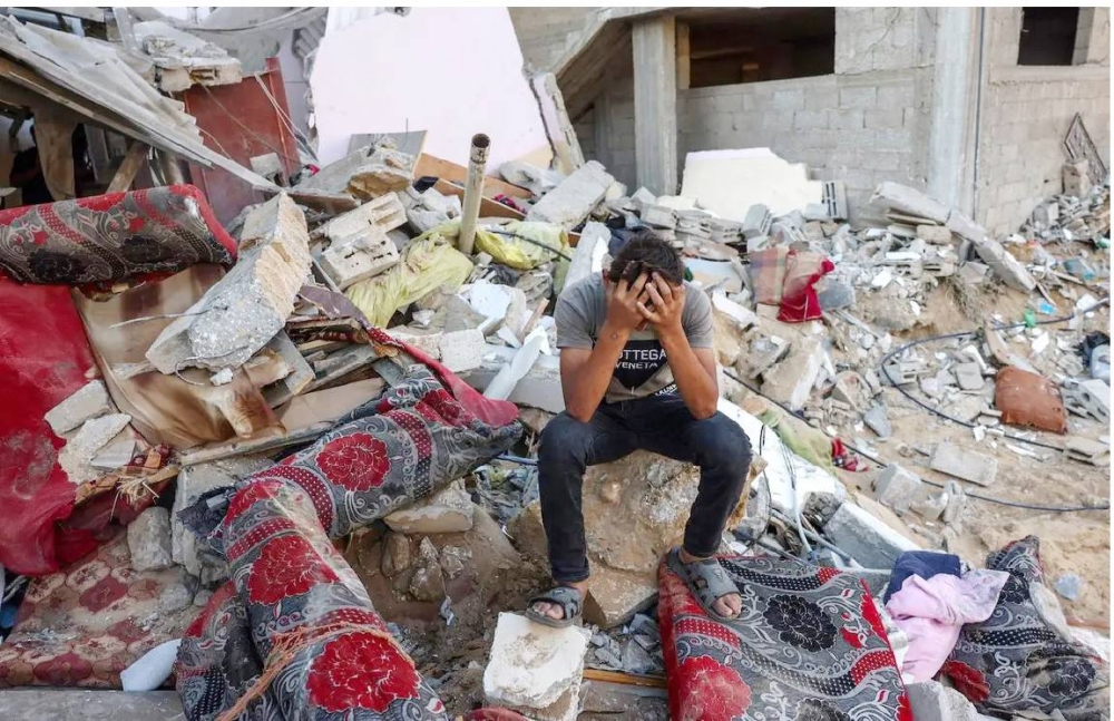 فلسطيني يبكي على أنقاض منزله الذي دمره العدوان الإسرائيلي.