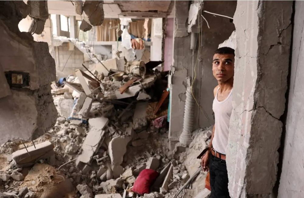فلسطيني يتحسر على منزله الذي دمره القصف الإسرائيلي على غزة.