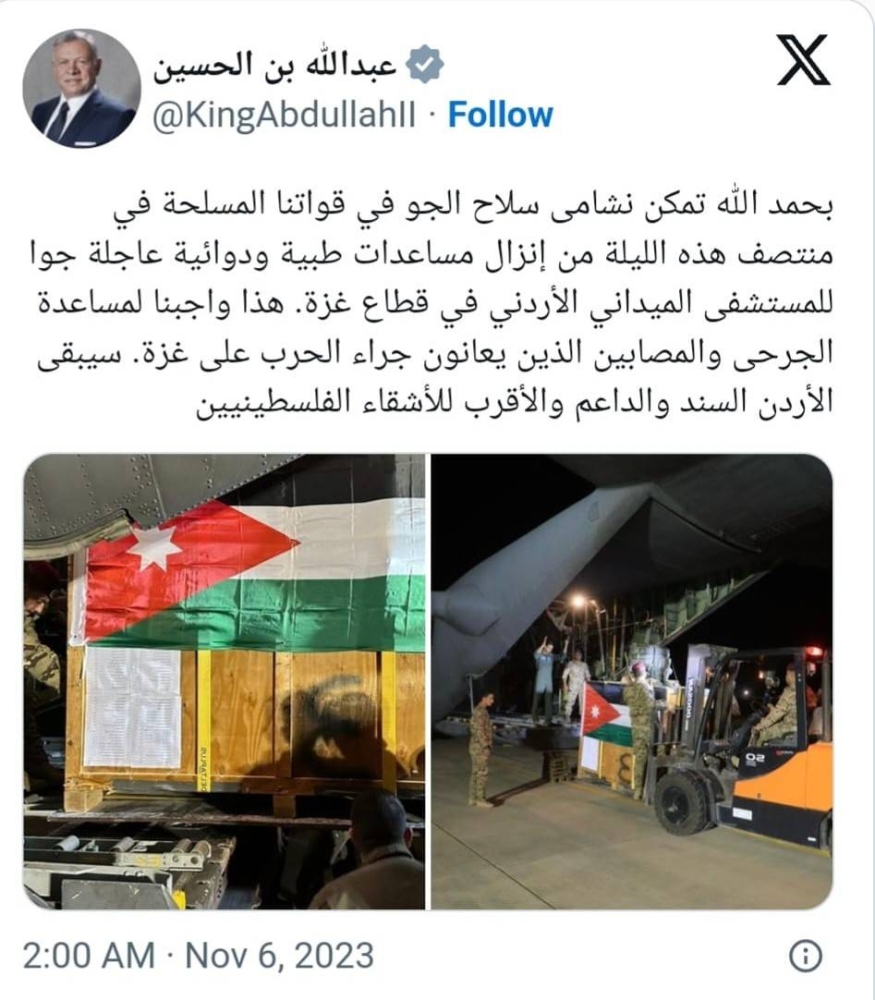 قال العاهل الأردني الملك عبدالله الثاني، في منشور على منصة إكس، فجر اليوم (الإثنين)، إن سلاح الجو الأردني تمكن في منتصف هذه الليلة من إنزال مساعدات طبية ودوائية عاجلة جوا للمستشفى الميداني الأردني في قطاع غزة.
