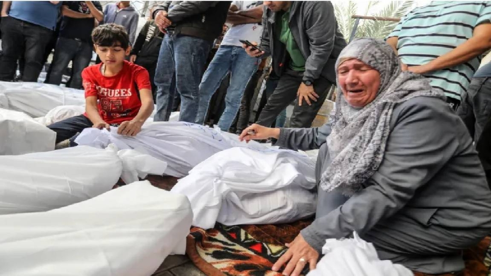 فلسطينية تنتحب بجوار جثامين ضحايا الحرب على غزة.