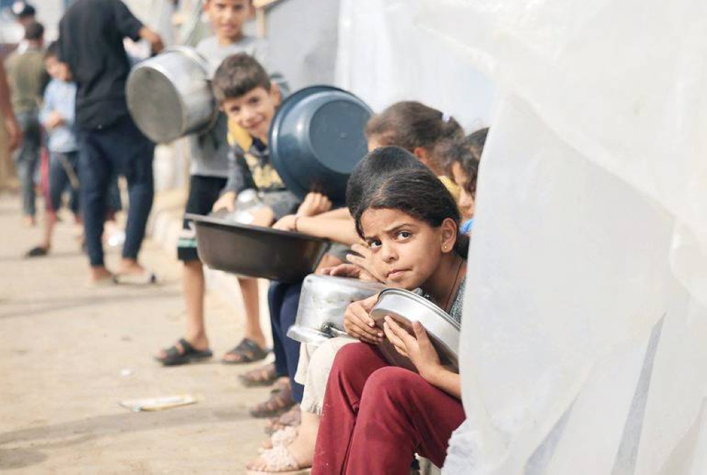 أطفال فلسطينيون بانتظار الحصول على الغذاء.
