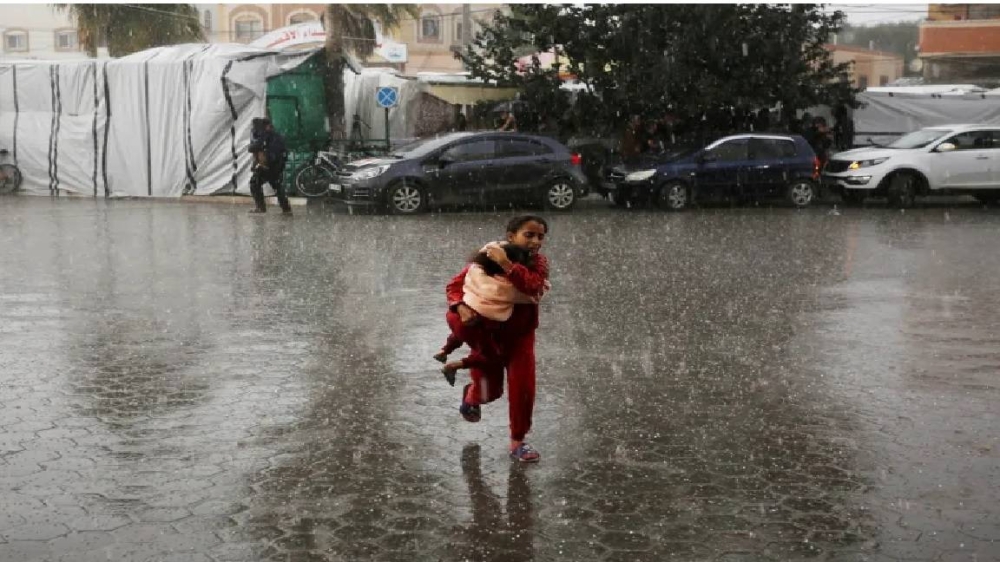 طفلة فلسطينية تحمل شقيقتها في تجسيد لمعاناة النازحين الذين يواجهون البرد والمطر والقصف الإسرائيلي .