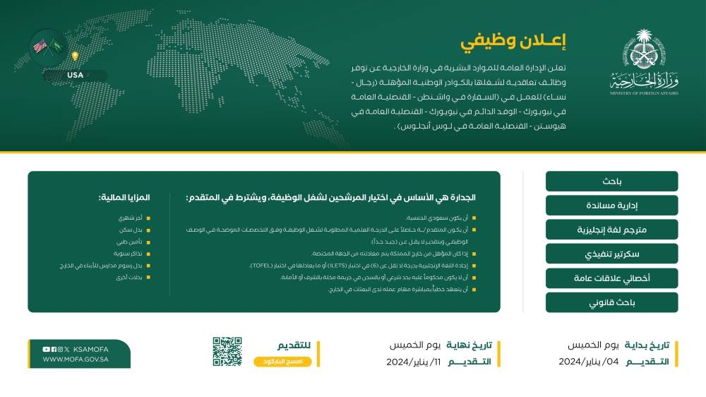 أعلنت الإدارة العامة للموارد البشرية في وزارة الخارجية توفر وظائف تعاقدية لشغلها بالكوادر الوطنية المؤهلة (رجال - نساء) للعمل في (السفارة في واشنطن، القنصلية العامة في نيويورك، الوفد الدائم في نيويورك، القنصلية العامة في هيوستن، والقنصلية العامة في لوس أنجليس).