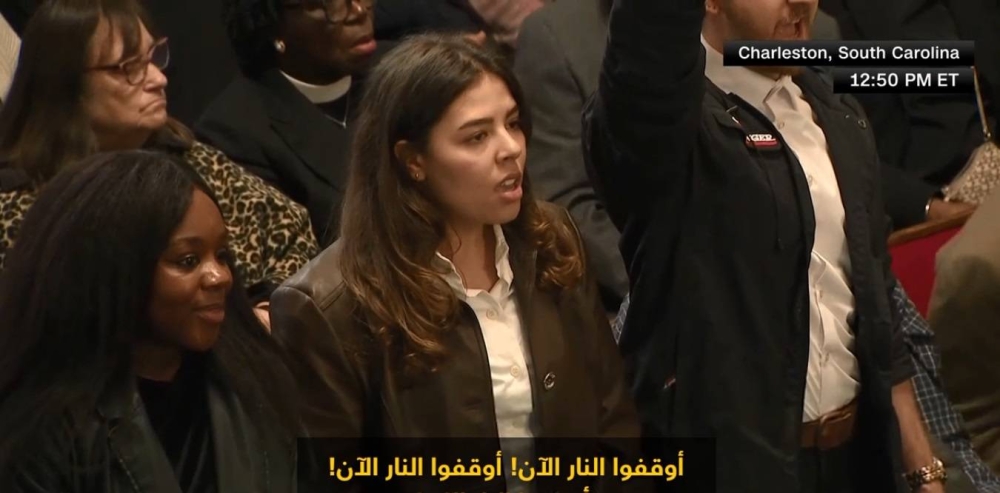 وأثناء حديث بايدن في «كنيسة الأم إيمانويل» في تشارلستون بولاية ساوث كارولينا الأمريكية وقوله «الحقيقة تتعرض لهجوم في أمريكا، وبالتالي فإن الأمر مماثل لحريتنا وديمقراطيتنا وبلادنا، لأنه دون الحقيقة لا يوجد ضوء، ودون ضوء لن يوجد طريق في هذا الظلام»، قاطعته محتجة لتقول «إذا كنت مهتماً حقاً بالأرواح التي فُقدت هنا، فعليك أن تحترم الأرواح التي فُقدت في غزة وتدعو إلى وقف إطلاق النار في فلسطين»، وبعدها بدأ عدد من الأشخاص بهتاف «أوقفوا النار الآن»، قبل أن يتم إخراجهم من القاعة.