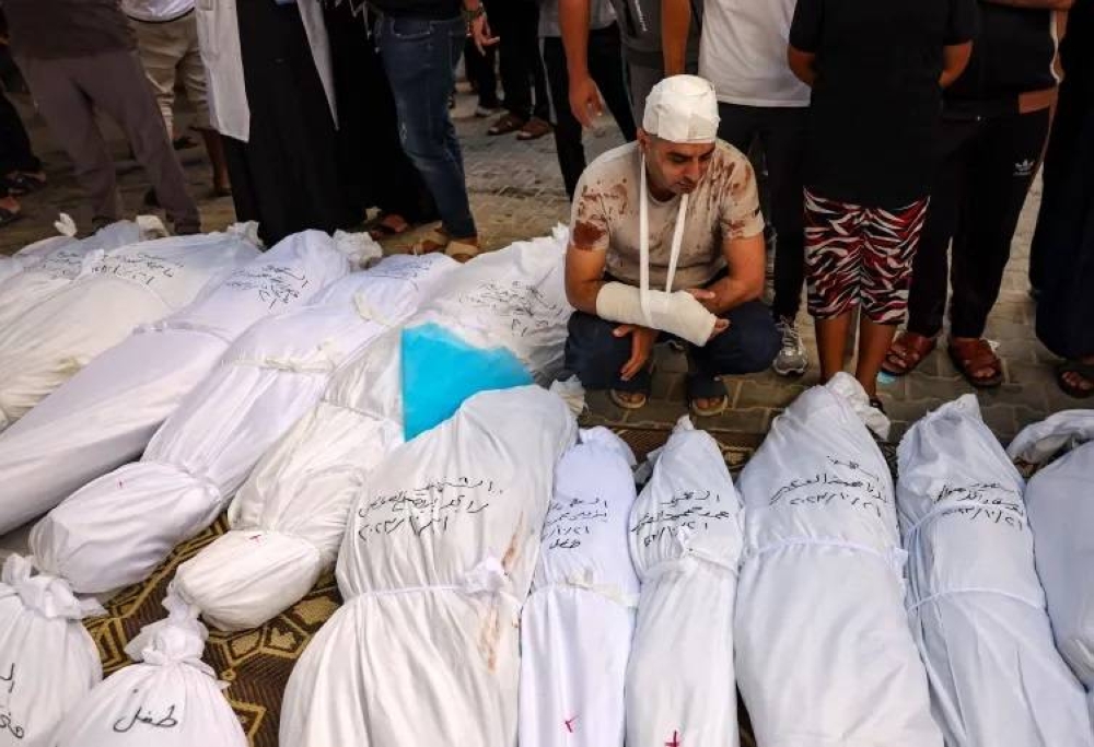 فلسطينيون يقفون على جثث اسرهم الذي أبادهم الإحتلال في غزة
