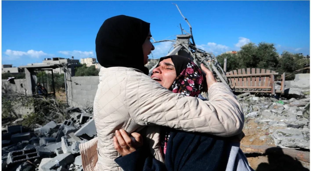 فلسطينيتان تبكيان خلال تشييع جثامين ضحايا الحرب على غزة